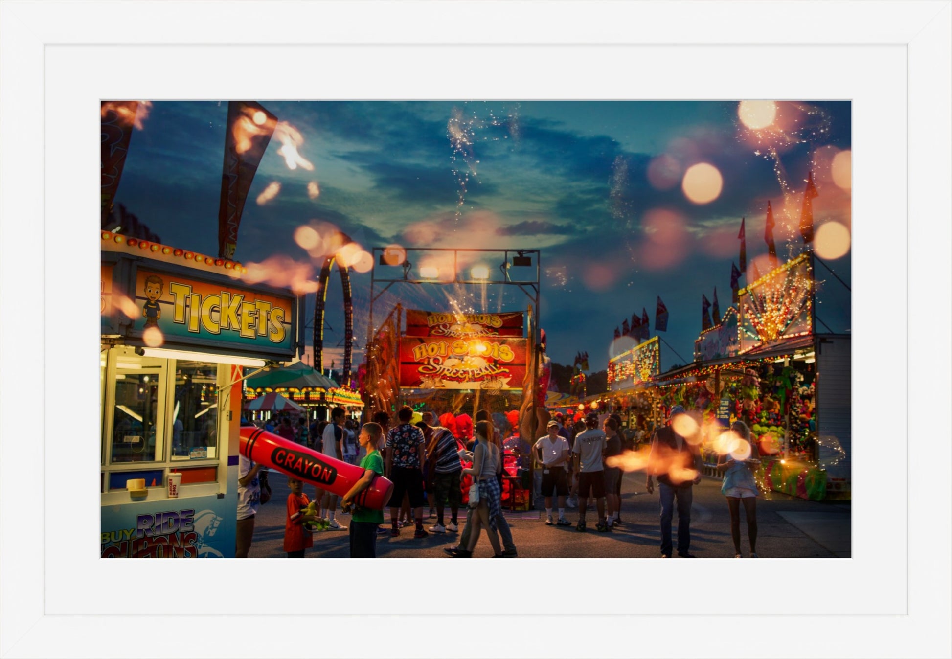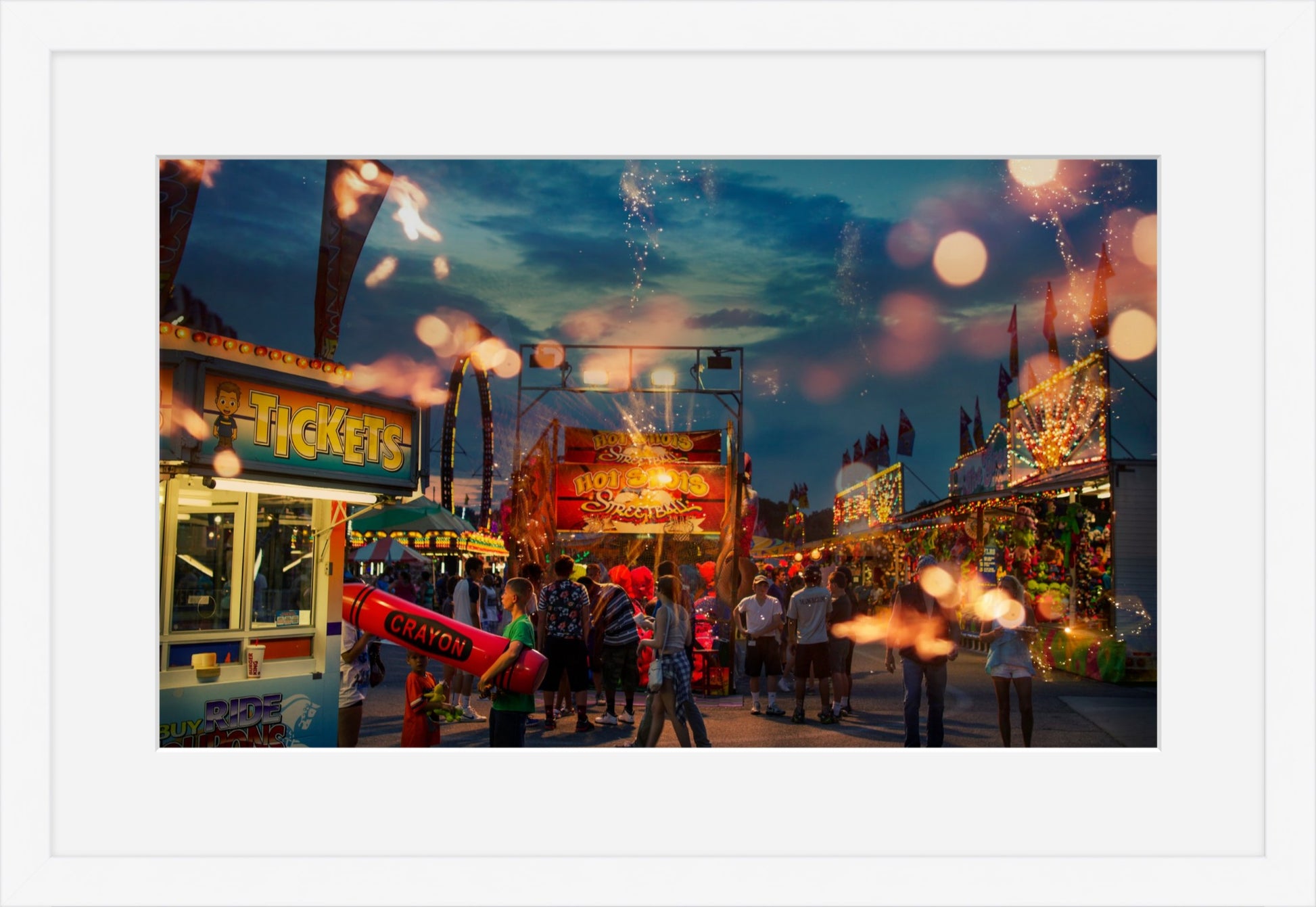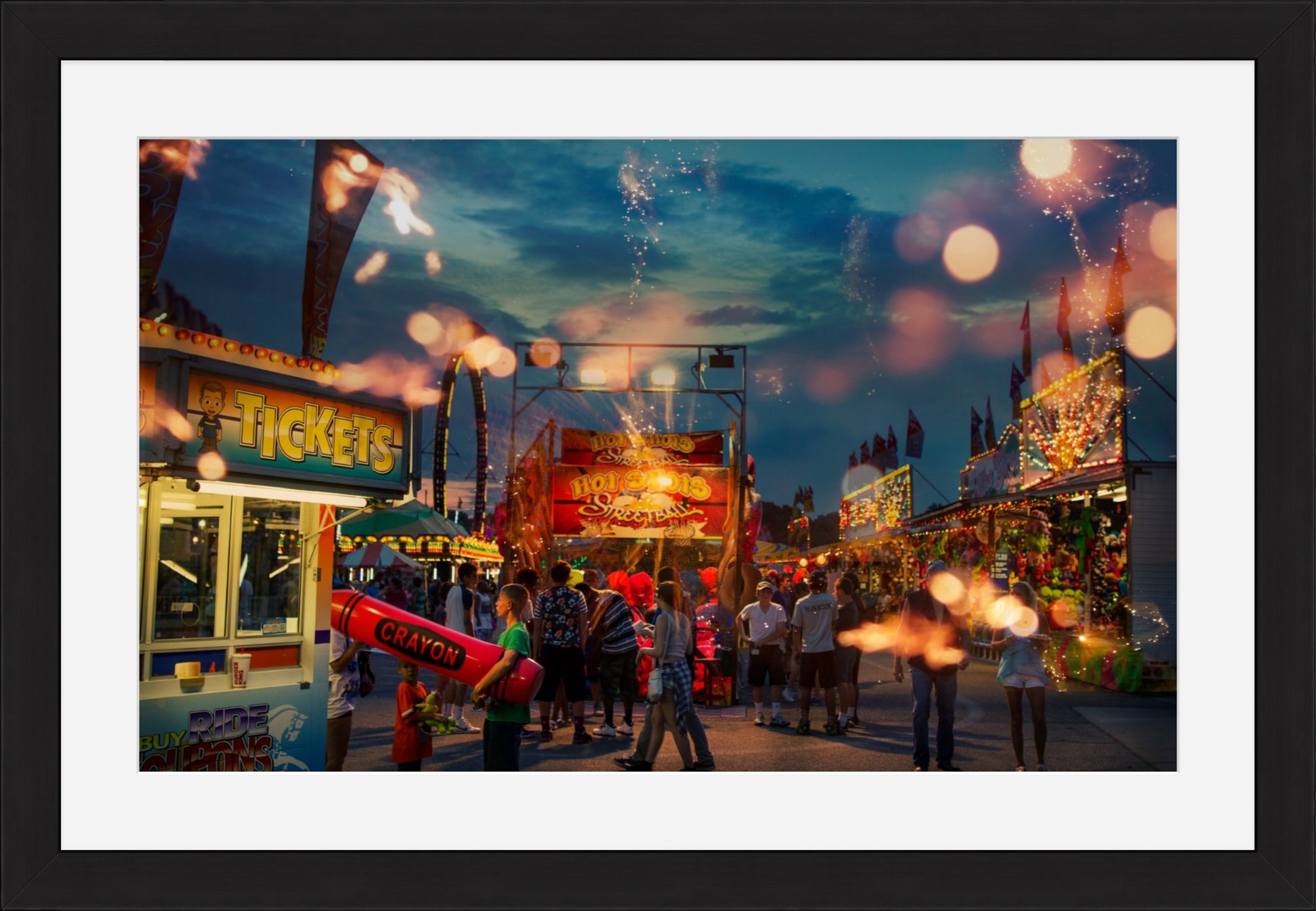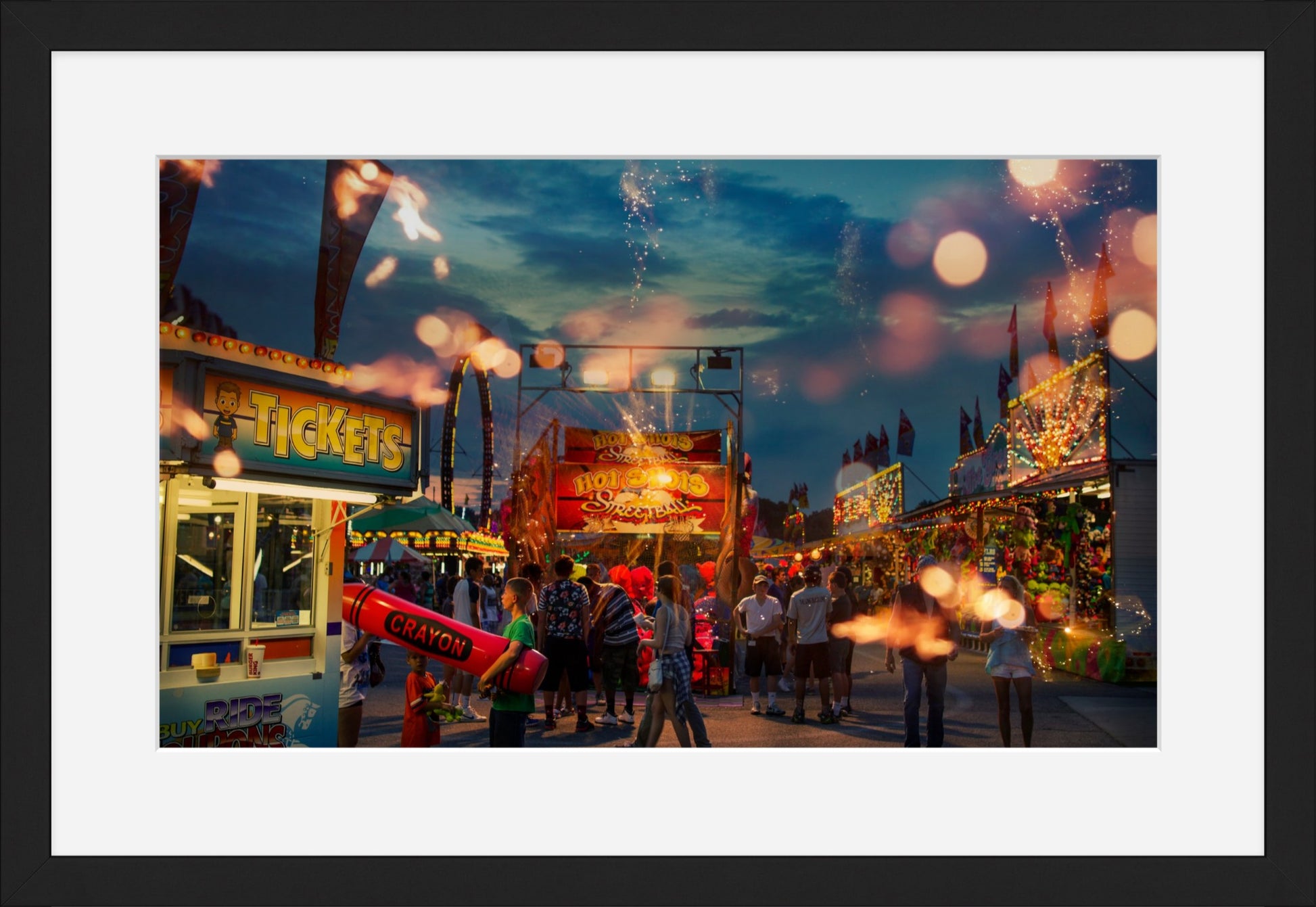"Expected Wonder #2" is a fine art photograph that captures the essence of the state fair, a place where people come together to revel in the joys of community, entertainment, and fun. The colors in the photograph are rich and vibrant, with the warm hues of the lights and the cool blues of the sky blending seamlessly to create a mesmerizing palette. The way the light reflects off the surfaces of the rides and the crowds adds depth and texture to the image, making it feel almost tactile.