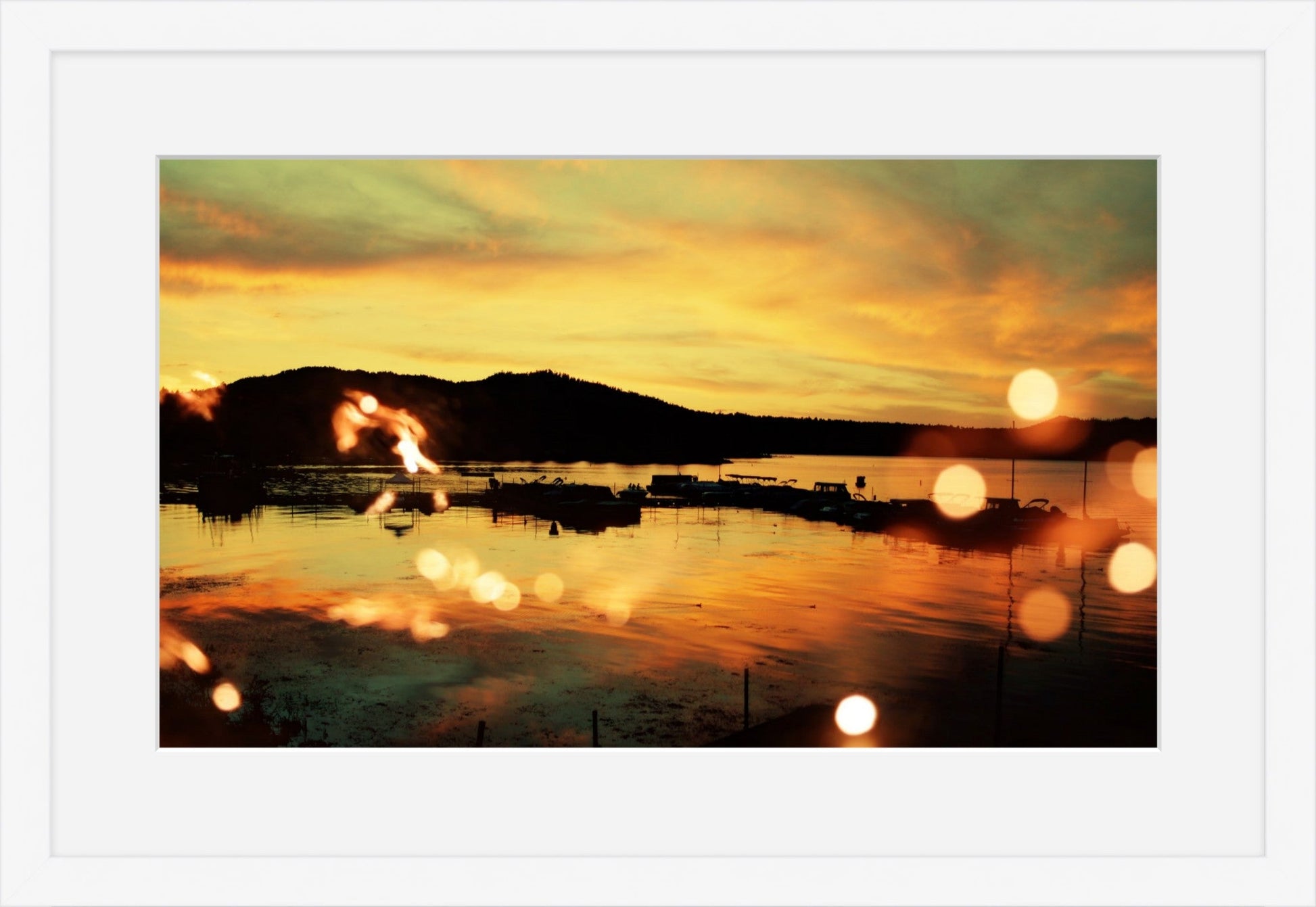 "Light Theory #4" shows Big Bear Lake at sunset, with the calm water reflecting deep gold and orange tones. In the foreground, flickering sparks of light add a layer of energy to the quiet scene. The photograph captures a moment of natural wonder, inviting the viewer to appreciate the inspiration found in a peaceful landscape.
