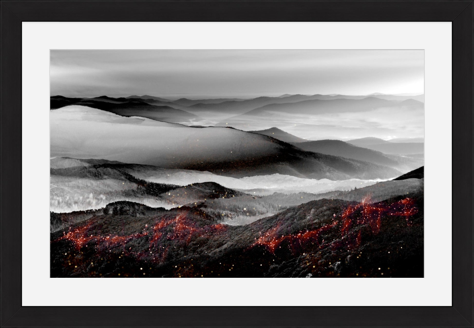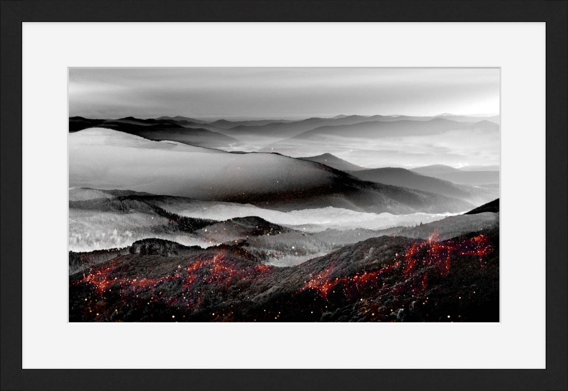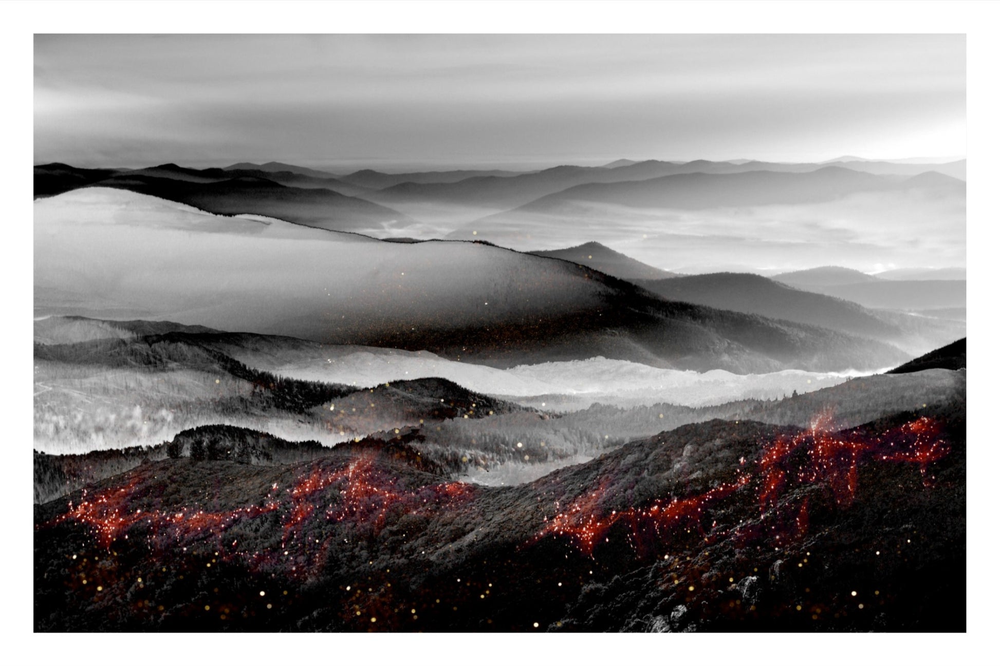 Lucent Mountainscape" is a digital collage featuring a monochromatic range of hills stretching toward the horizon. Bold bursts of red light break through the grayscale landscape, adding a sense of energy and passion to the quiet scene. It explores the balance between stillness and inspiration, highlighting the vibrancy that can be found within a calm environment.
